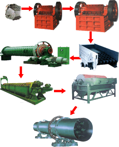 開礦主要是由顎式破碎機,洗礦機,球磨機,振動給料機,螺旋分級機,高強度磁選機,等設備組成,以下是工藝流程圖