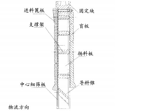 運行時前倉內已磨好的物料通過進料篦板進人揚料板上.,隨著球磨機的回轉被提升導向落到錐形篩板上,細料通過錐形篩板的篩縫落到卸料錐上而流人后倉,未通過篩縫的粗料則沿著錐形篩板的表面流問一倉重新粉磨。